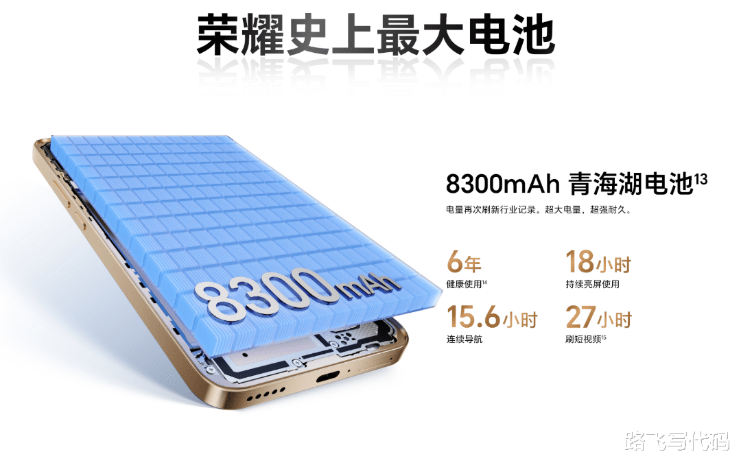 亮点二荣耀X70搭载了荣耀史上最大的电池,8300mAh的青海湖超大容量电池,可以保持18小时的超长亮屏使用,电量刷新业界记录。