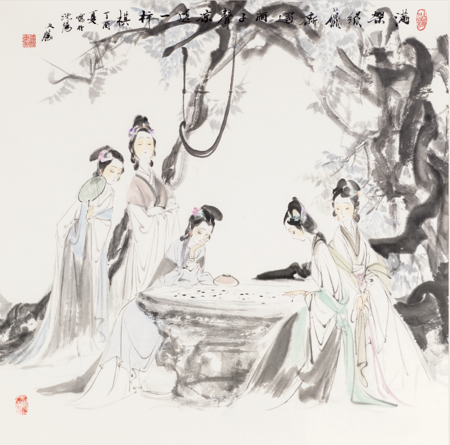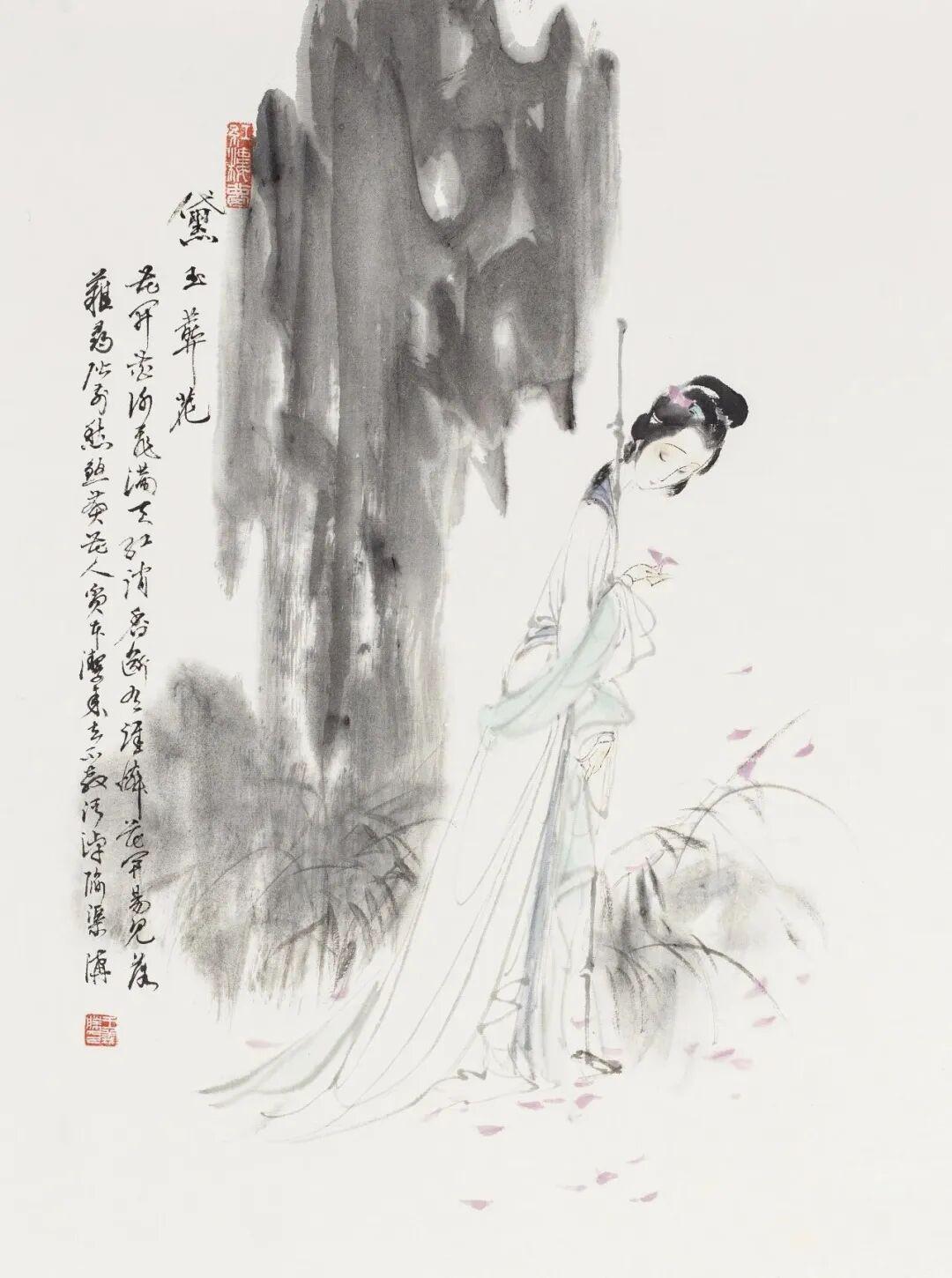 那么,王义胜的“十二钗”则以水墨为主导,淡彩相辅,着重“神似也形似”的小写意,突出人物轻盈纤巧的一面。