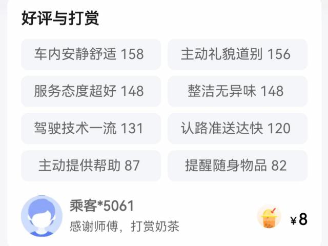 2023 年,蒋露开始成为一名网约车司机。她的后台收到了无数好评。"有乘客下车时,会递给我一瓶饮料,还有很多人通过后台向我打赏红包。"让蒋露印象深刻的是一位男乘客,那是一年中秋节晚上,她将乘客送到目的地后,乘客用手机敲了一行字递给她看:"节日的晚上,跑车真不容易。我为你打赏了 200 元红包,早点回家,吃点好吃的信钰配资,节日快乐!"在陌生的城市,这段文字一直温暖着蒋露。