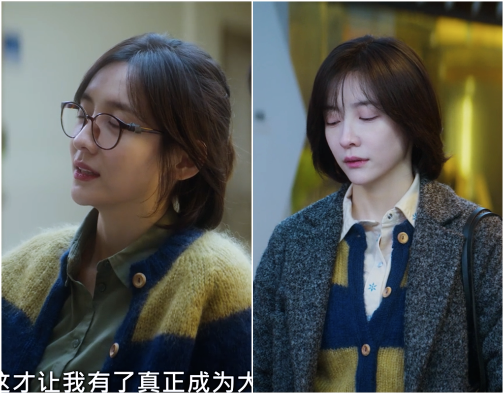 像大学重遇这一幕,就设计了蓝黄这组对比色的造型,来体现商燕和訚重的性格底色,既暗喻两人性格的差异,也暗示两人往后人生的对抗和冲突。▼